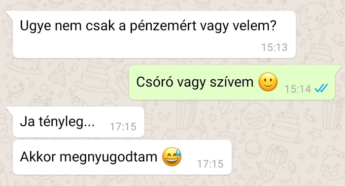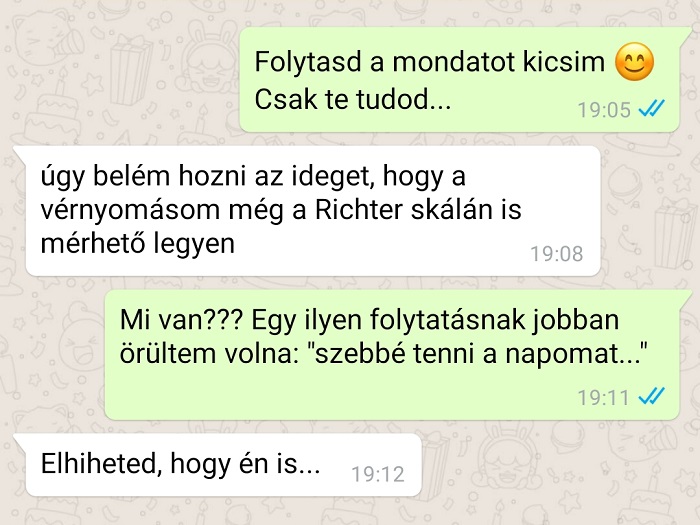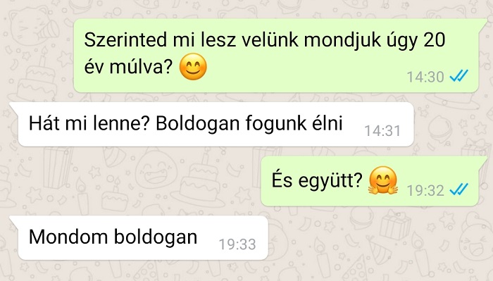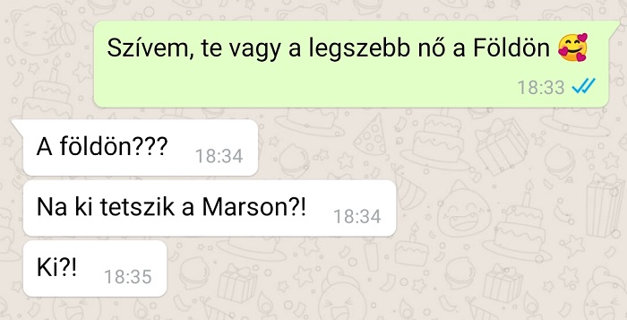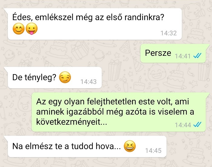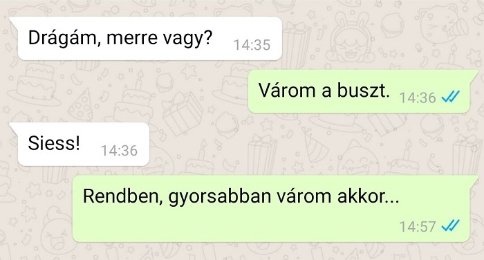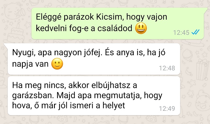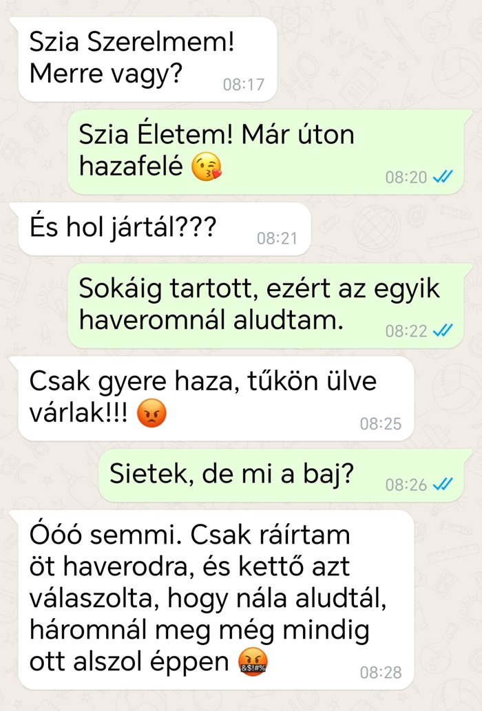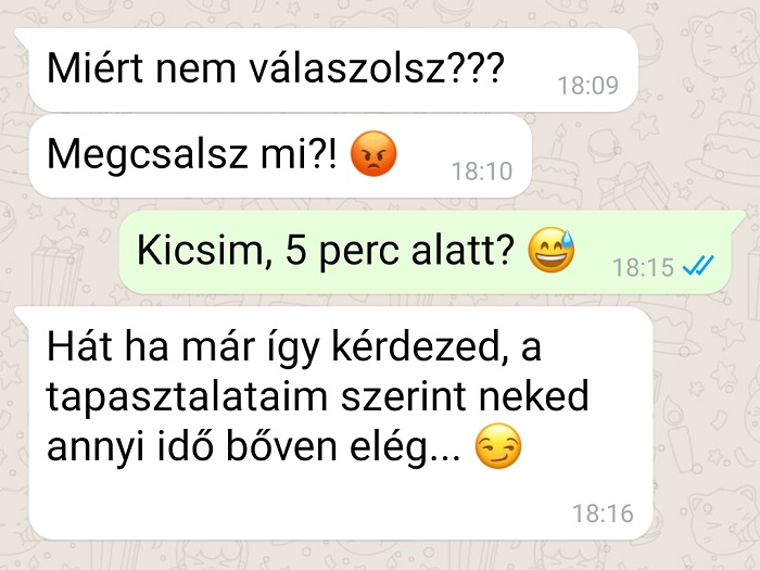 Egy harmonikus párkapcsolatban beleférnek az egymás közti csipkelődő és humoros üzenetváltások. Manapság az okostelefonokat már inkább üzenetváltásra használják az emberek, mint tényleges telefonbeszélgetések lebonyolítására. Talán azért, mert az üzenetekben történő kommunikáció kevésbé kötött. Nincs rá szükség hozzá, hogy mindkét fél ráérjen ugyanabban az időpontban, és a szavainkat is jobban megválogathatjuk, átgondolhatjuk, mielőtt rányomnák a küldés gombra. Persze, ez még nem jelenti azt automatikusan, hogy mindig, minden helyzetben ki is használjuk ezt az utóbb említett előnyét. Naközben, amikor a párok éppen nincsenek együtt, akkor ők is inkább rövid üzenetek segítségével tartják egymással a kapcsolatot, és ebből bizony néha csípős, és egyben mulatságos üzenetváltások is kisülhetnek