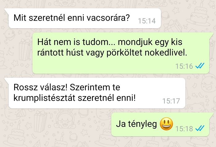 16. A feleség jobban tudja, hogy a férje valójában mit is szeretne enni vacsorára.