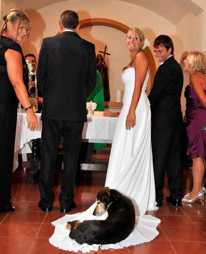 2. A kutyánk is ott volt az esküvőn, aki a szertartás közben úgy döntött, hogy menyasszonyi ruhámon helyezi magát kényelembe.