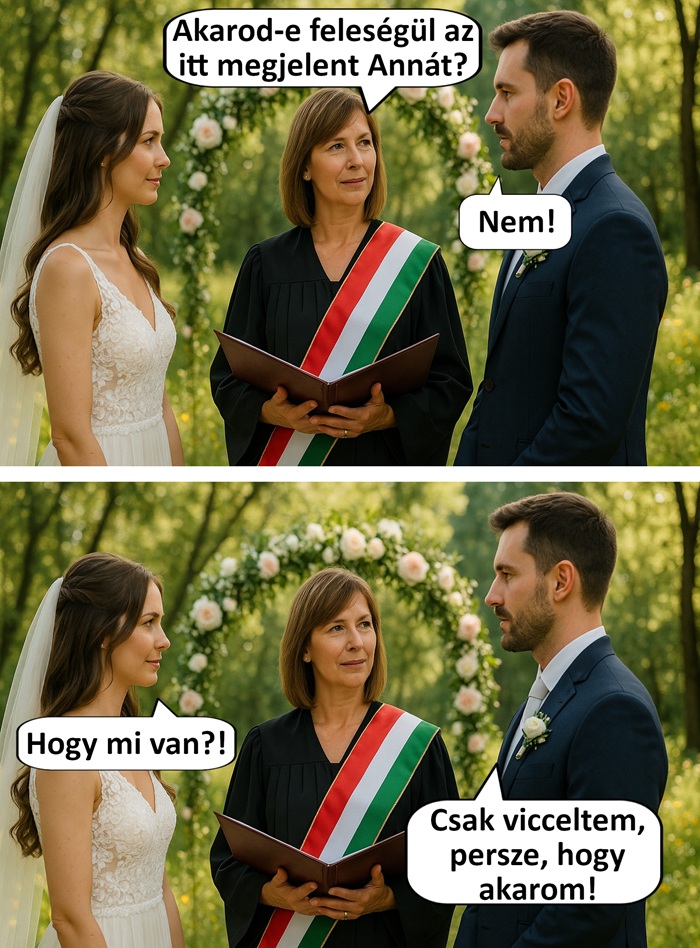 20. Amikor az esküvőn elhangzott a nagy kérdés, hogy „Akarod-e feleségül az itt megjelent Annát?”, a vőlegény némi hezitálás után rávágta: „Nem.”
