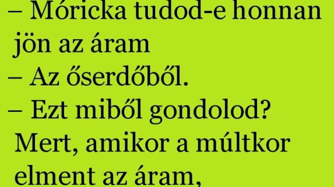 A tanár felelteti Mórickát: – Móricka tudod-e honnan jön az áram? – Az őserdőből. – Ezt miből gondolod? – Mert, amikor a múltkor elment az…