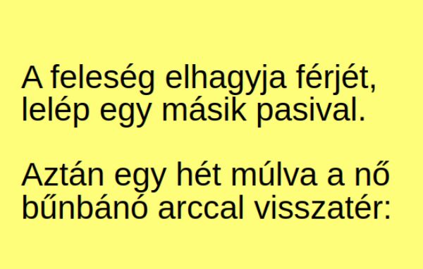 A feleség elhagyja férjét, lelép egy másik pasival. Aztán egy hét múlva a nő bűnbánó arccal visszatér: – Bocsásd meg nekem, hogy elhagytalak… Rájöttem, hogy…