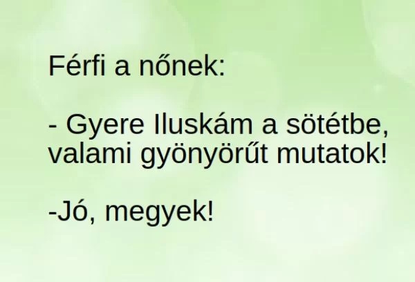 Férfi a nőnek: – Gyere Iluskám a sötétbe, valami gyönyörűt mutatok! -Jó, megyek! – Nézd csak, milyen gyönyörűen világít az órán! -Te hvlye f*sz, már…