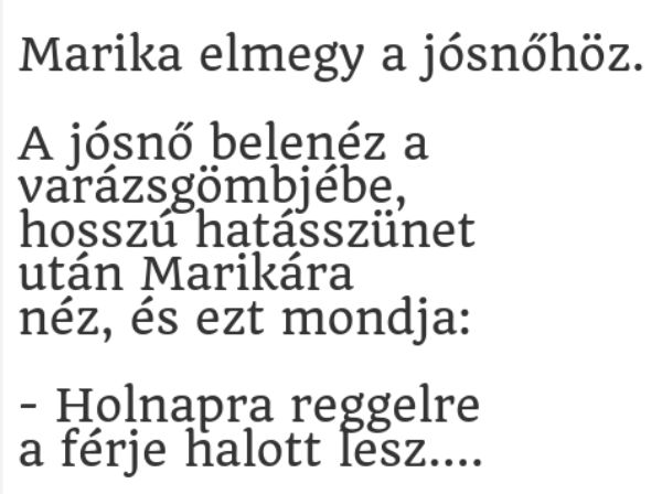 Marika elmegy a jósnőhöz. A jósnő belenéz a varázsgömbjébe, hosszú hatásszünet után Marikára néz, és ezt mondja: – Holnapra reggelre a férje halott lesz. –…