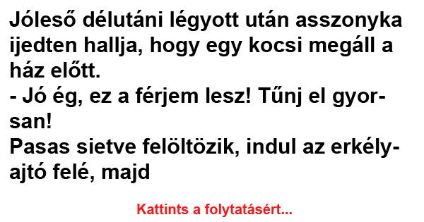 Jóleső délutáni légyott után asszonyka ijedten hallja, hogy egy kocsi megáll a ház előtt. – Jó ég, ez a férjem lesz! Tűnj el gyorsan! Pasas…