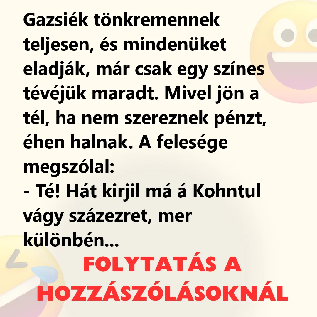 Gazsiék tönkremennek teljesen, és mindenüket eladják, már csak egy színes tévéjük maradt. Mivel jön a tél, ha nem szereznek pénzt, éhen halnak. A felesége megszólal:…