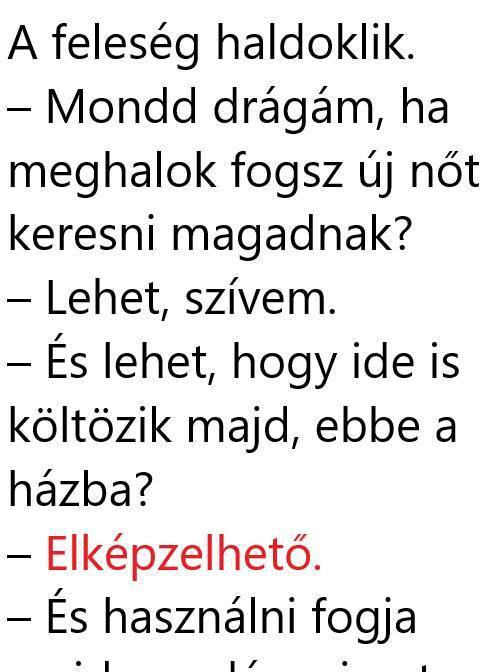 A feleség haldoklik. – Mondd drágám, ha meghalok fogsz új nőt keresni magadnak? – Lehet, szívem. – És lehet, hogy ide is költözik majd, ebbe…
