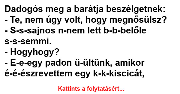 Dadogós meg a barátja beszélgetnek: – Te, nem úgy volt, hogy megnősülsz? – S-s-sajnos n-nem lett b-b-belőle s-s-semmi. – Hogyhogy? – E-e-egy padon ü-ültünk, amikor…