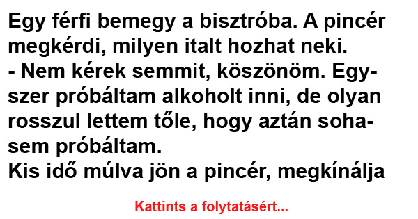 Egy férfi bemegy a bisztróba. A pincér megkérdi, milyen italt hozhat neki. – Nem kérek semmit, köszönöm. Egyszer próbáltam alkoholt inni, de olyan rosszul lettem…