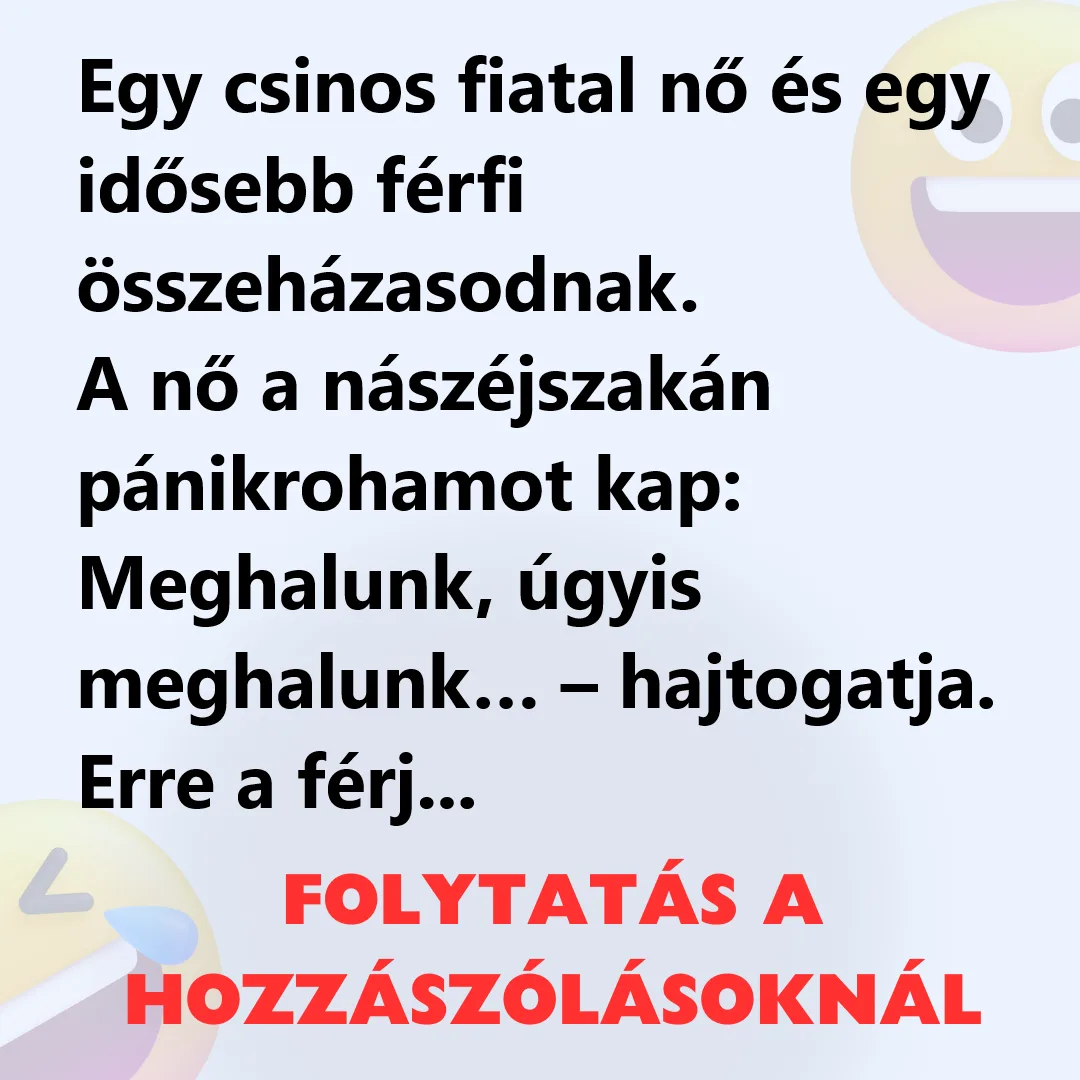 Egy csinos fiatal nő és egy idősebb férfi összeházasodnak. A nő a nászéjszakán pánikrohamot kap: Meghalunk, úgyis meghalunk… – hajtogatja. Erre a férj: – de…