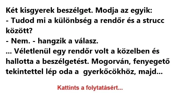 Két kisgyerek beszélget. Mondja az egyik: – Tudod mi a különbség a rendőr és a strucc között? – Nem. – hangzik a válasz. Véletlenül egy…
