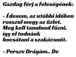 – Édesem, az utóbbi időben rosszul megy az üzlet. Meg kell tanulnod főzni, így el tudnánk bocsátani a szakácsnőt. – Persze Drágám.. De nekem van…