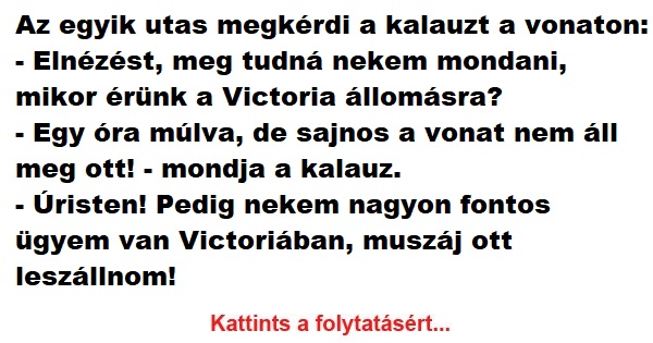 Az egyik utas megkérdi a kalauzt a vonaton: – Elnézést, meg tudná nekem mondani, mikor érünk a Victoria állomásra? – Egy óra múlva, de sajnos…