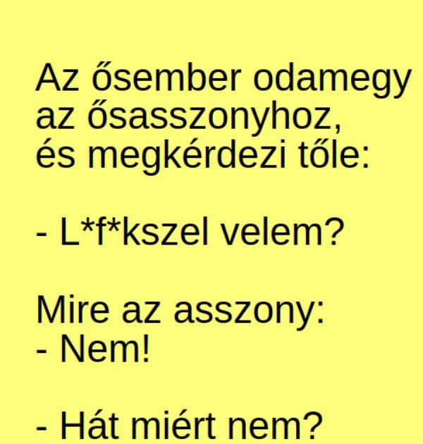 Az ősember odamegy az ősasszonyhoz, és megkérdezi tőle: – L*f*kszel velem? Mire az asszony: – Nem! – Hát miért nem? – Nincs kedvem! Erre az…