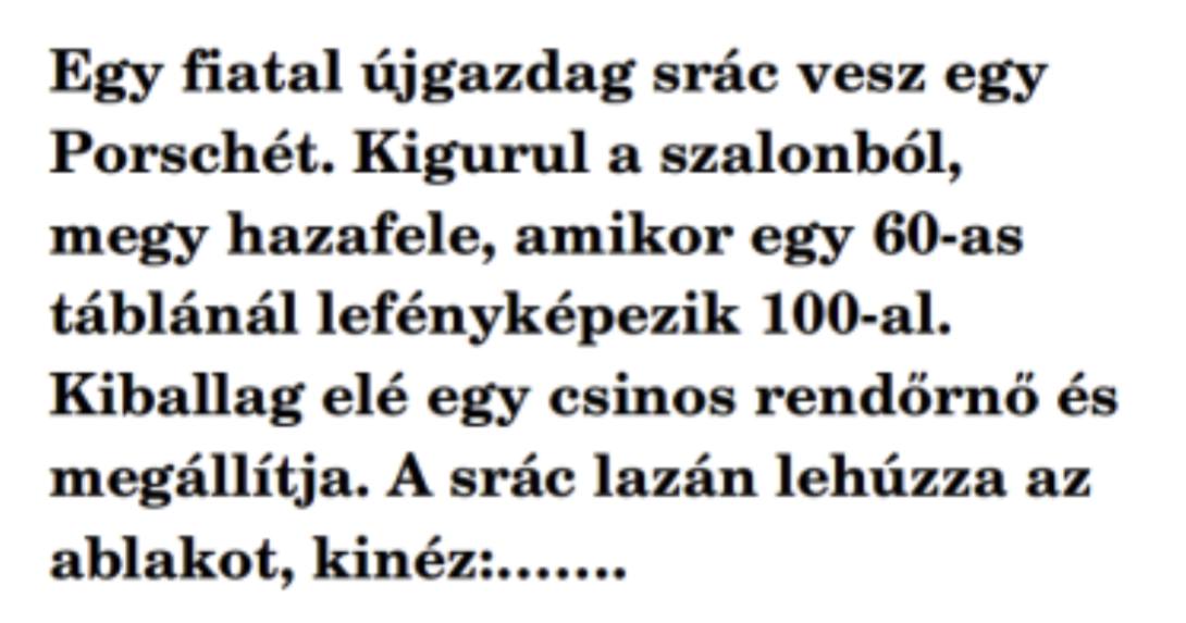 Egy fiatal újgazdag srác vesz egy Porschét. Kigurul a szalonból, megy hazafele, amikor egy 60-as táblánál lefényképezik 100-al. Kiballag elé egy csinos rendőrnő és megállítja.…