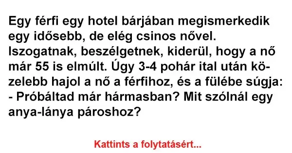 Egy férfi egy hotel bárjában megismerkedik egy idősebb, de elég csinos nővel. Iszogatnak, beszélgetnek, kiderül, hogy a nő már 55 is elmúlt. Úgy 3-4 pohár…