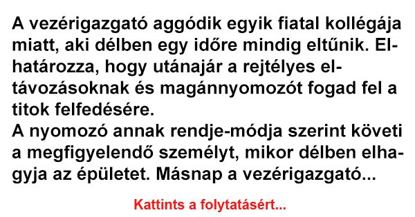 A vezérigazgató aggódik egyik fiatal kollégája miatt, aki délben egy időre mindig eltűnik. Elhatározza, hogy utánajár a rejtélyes eltávozásoknak és magánnyomozót fogad fel a titok…