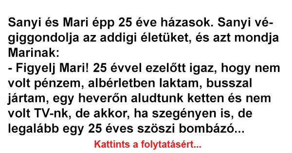 Sanyi és Mari épp 25 éve házasok. Sanyi végiggondolja az addigi életüket, és azt mondja Marinak: – Figyelj Mari! 25 évvel ezelőtt igaz, hogy nem…