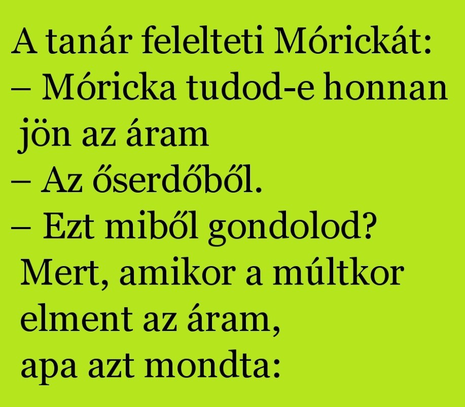 A tanár felelteti Mórickát: – Móricka tudod-e honnan jön az áram? – Az őserdőből. – Ezt miből gondolod? – Mert, amikor a múltkor elment az…