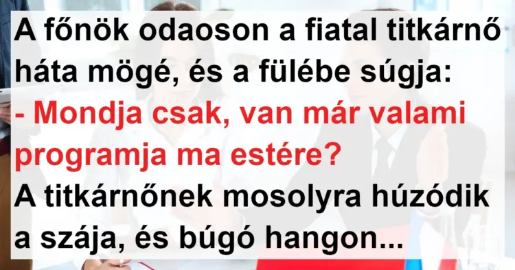 A főnök sugdolózni kezdett a fiatal titkárnővel A titkárnő elsőre még megörült a főnöke kérdésének, de aztán azért gyorsan lebiggyedt a szája, amikor a főnök…