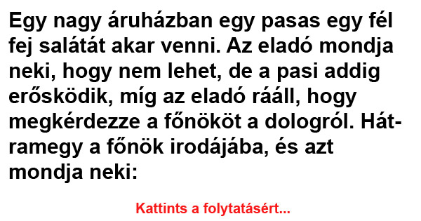 Egy nagy áruházban egy pasas egy fél fej salátát akar venni. Az eladó mondja neki, hogy nem lehet, de a pasi addig erősködik, míg az…