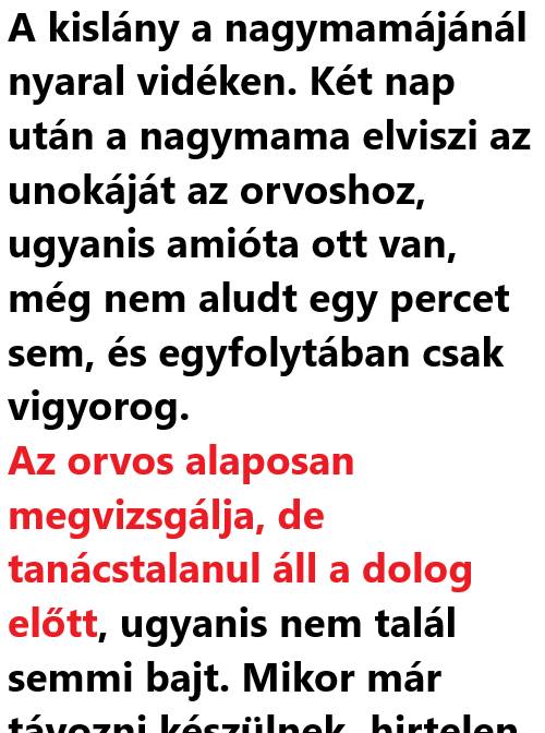 A kislány a nagymamájánál nyaral vidéken. Két nap után a nagymama elviszi az unokáját az orvoshoz, ugyanis amióta ott van, még nem aludt egy percet…