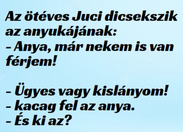 Az ötéves Juci dicsekszik az anyukájának – Anya, már nekem is van férjem! – Ügyes vagy kislányom! – kacag fel az anya. – És ki…