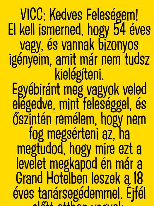 Kedves Feleségem! El kell ismerned, hogy 54 éves vagy, és vannak bizonyos igényeim, amit már nem tudsz kielégíteni. Egyébiránt meg vagyok veled elégedve, mint feleséggel,…