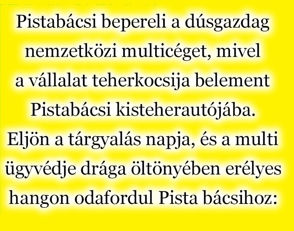 Pistabácsi bepereli a dúsgazdag nemzetközi multicéget, mivel a vállalat teherkocsija belement Pistabácsi kisteherautójába. Eljön a tárgyalás napja, és a multi ügyvédje drága öltönyében erélyes hangon…