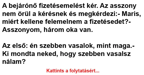 A bejárónő fizetésemelést kér. Az asszony nem örül a kérésnek és megkérdezi: – Maris, miért kellene felemelnem a fizetésedet? – Asszonyom, három oka van. Az…
