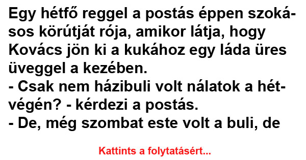 Egy hétfő reggel a postás éppen szokásos körútját rója, amikor látja, hogy Kovács jön ki a kukához egy láda üres üveggel a kezében. – Csak…