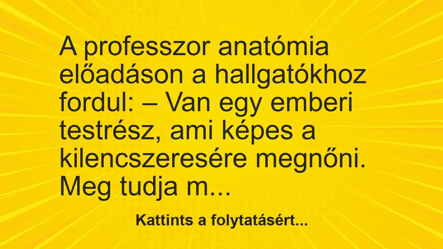 A professzor anatómia előadáson a hallgatókhoz fordul: – Van egy emberi testrész, ami képes a kilencszeresére megnőni. Meg tudja mondani valaki, hogy melyik testrész az?…