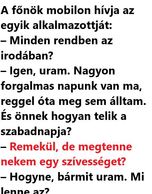 A főnök mobilon hívja az egyik alkalmazottját: – Minden rendben az irodában? – Igen, uram. Nagyon forgalmas napunk van ma, reggel óta meg sem álltam.…