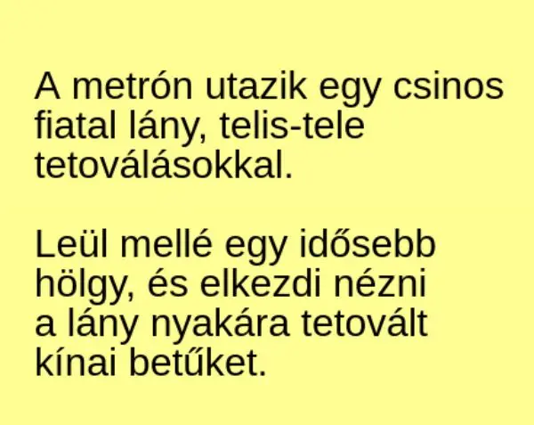 A metrón utazik egy csinos fiatal lány, telis-tele tetoválásokkal. Leül mellé egy idősebb hölgy, és elkezdi nézni a lány nyakára tetovált kínai betűket. A lány…