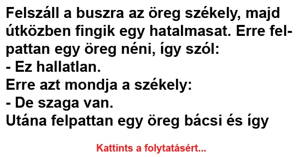 Felszáll a buszra az öreg székely, majd útközben fingik egy hatalmasat. Erre felpattan egy öreg néni, így szól: – Ez hallatlan. Erre azt mondja a…
