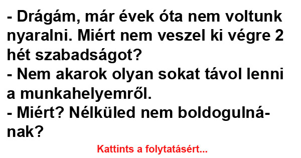 – Drágám, már évek óta nem voltunk nyaralni. Miért nem veszel ki végre 2 hét szabadságot? – Nem akarok olyan sokat távol lenni a munkahelyemről.…