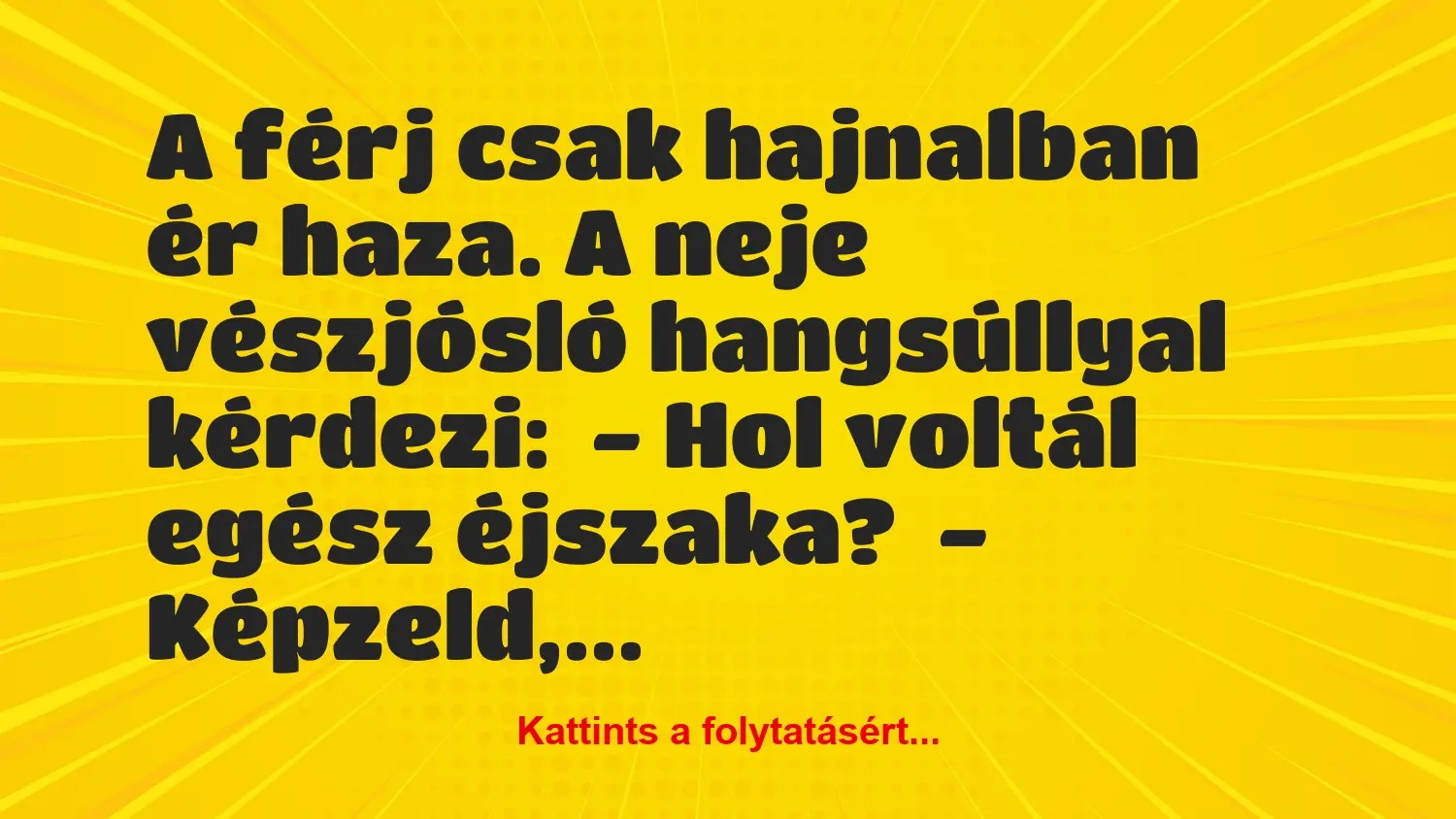 A férj csak hajnalban ér haza. A neje vészjósló hangsúllyal kérdezi: – Hol voltál egész éjszaka? – Képzeld, drágám, az új titkárnőm munkaidő végén behozott…