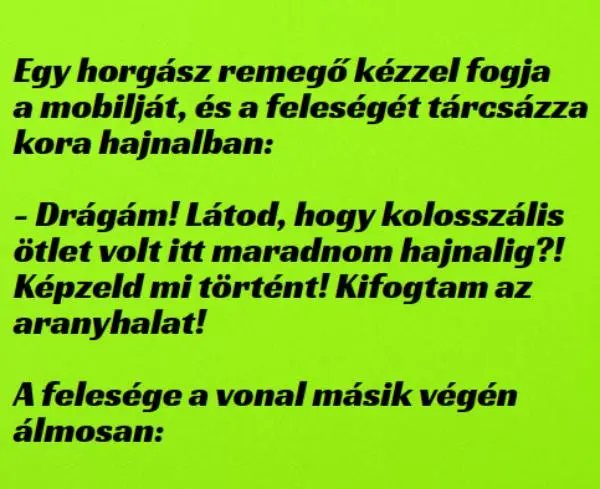Egy horgász remegő kézzel fogja a mobilját, és a feleségét tárcsázza kora hajnalban: – Drágám! Látod, hogy kolosszális ötlet volt itt maradnom hajnalig?! Képzeld mi…