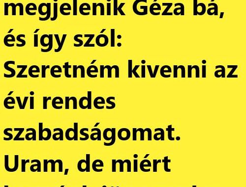 Az Adóhivatalban megjelenik Géza bá, és így szól: Szeretném kivenni az évi rendes szabadságomat. Uram, de miért hozzánk jön ezzel a kéréssel? Hova menjek, amikor…