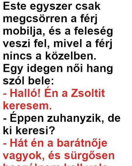 Este egyszer csak megcsörren a férj mobilja, és a feleség veszi fel, mivel a férj nincs a közelben. Egy idegen női hang szól bele: –…
