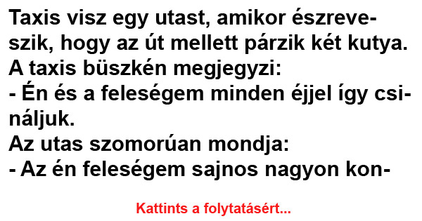 Taxis visz egy utast, amikor észreveszik, hogy az út mellett párzik két kutya. A taxis büszkén megjegyzi: – Én és a feleségem minden éjjel így…