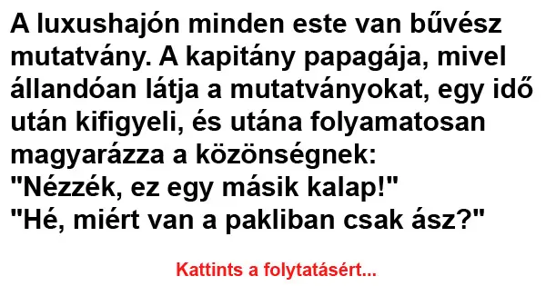 A luxushajón minden este van bűvész mutatvány. A kapitány papagája, mivel állandóan látja a mutatványokat, egy idő után kifigyeli, és utána folyamatosan magyarázza a közönségnek:…