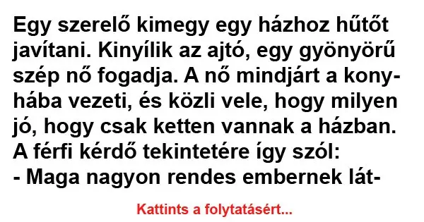 Egy szerelő kimegy egy házhoz hűtőt javítani. Kinyílik az ajtó, egy gyönyörű szép nő fogadja. A nő mindjárt a konyhába vezeti, és közli vele, hogy…