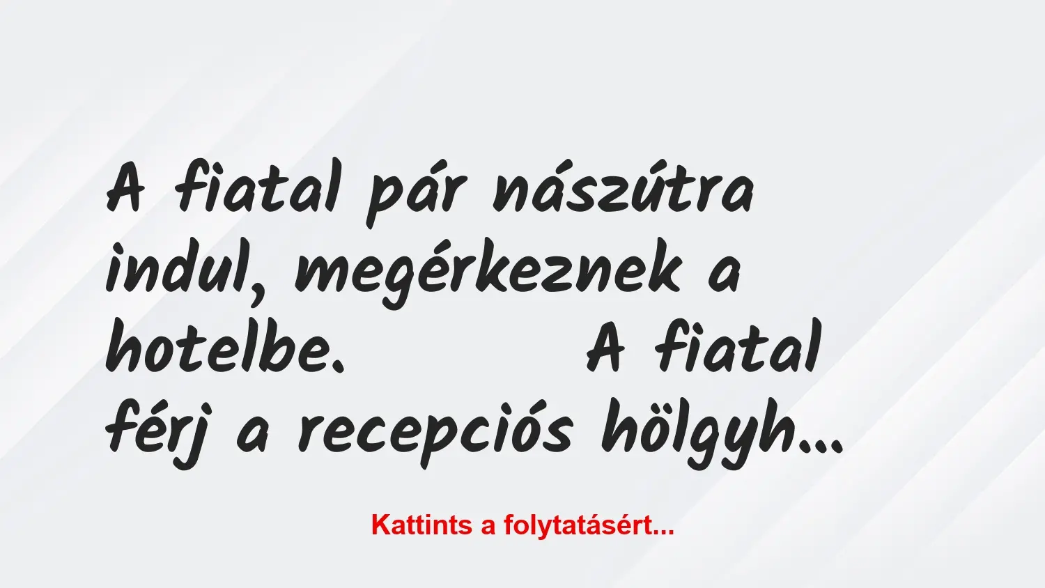 A fiatal pár nászútra indul, megérkeznek a hotelbe. A fiatal férj a recepciós hölgyhöz fordul: – Egész hétre szeretném kivenni a szobát. Erre a recepciós…