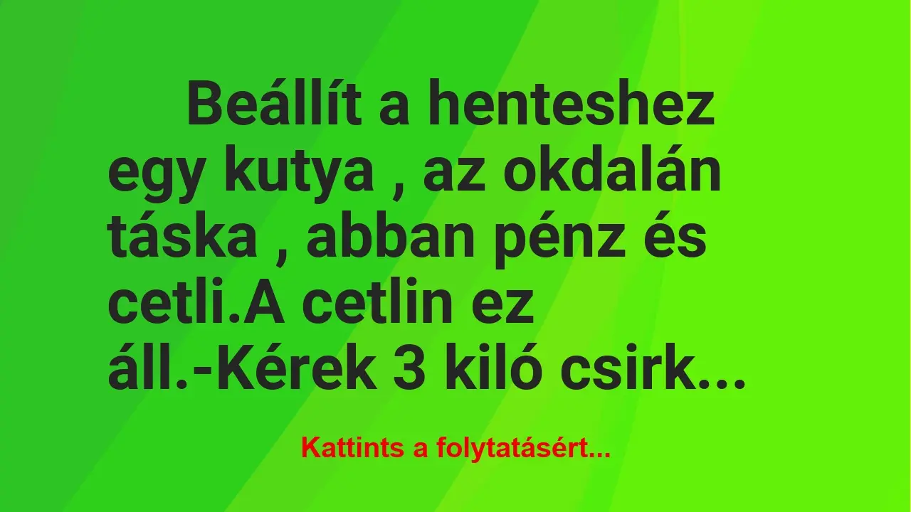 Beállít a henteshez egy kutya , az okdalán táska , abban pénz és cetli. A cetlin ez áll. -Kérek 3 kiló csirkecombot ! A hentes…