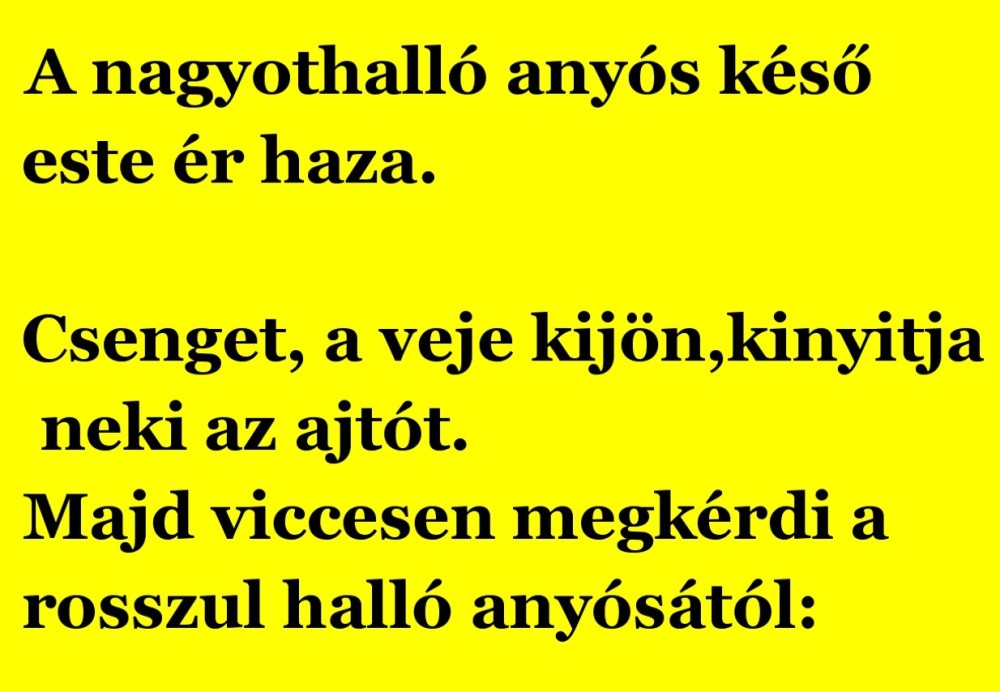 A nagyothalló anyóskéső este ér haza. Csenget, a veje kijön,kinyitja neki az ajtót. Majd viccesen megkérdi a rosszul halló anyósától: – Na mi van öreglány,hazaért…