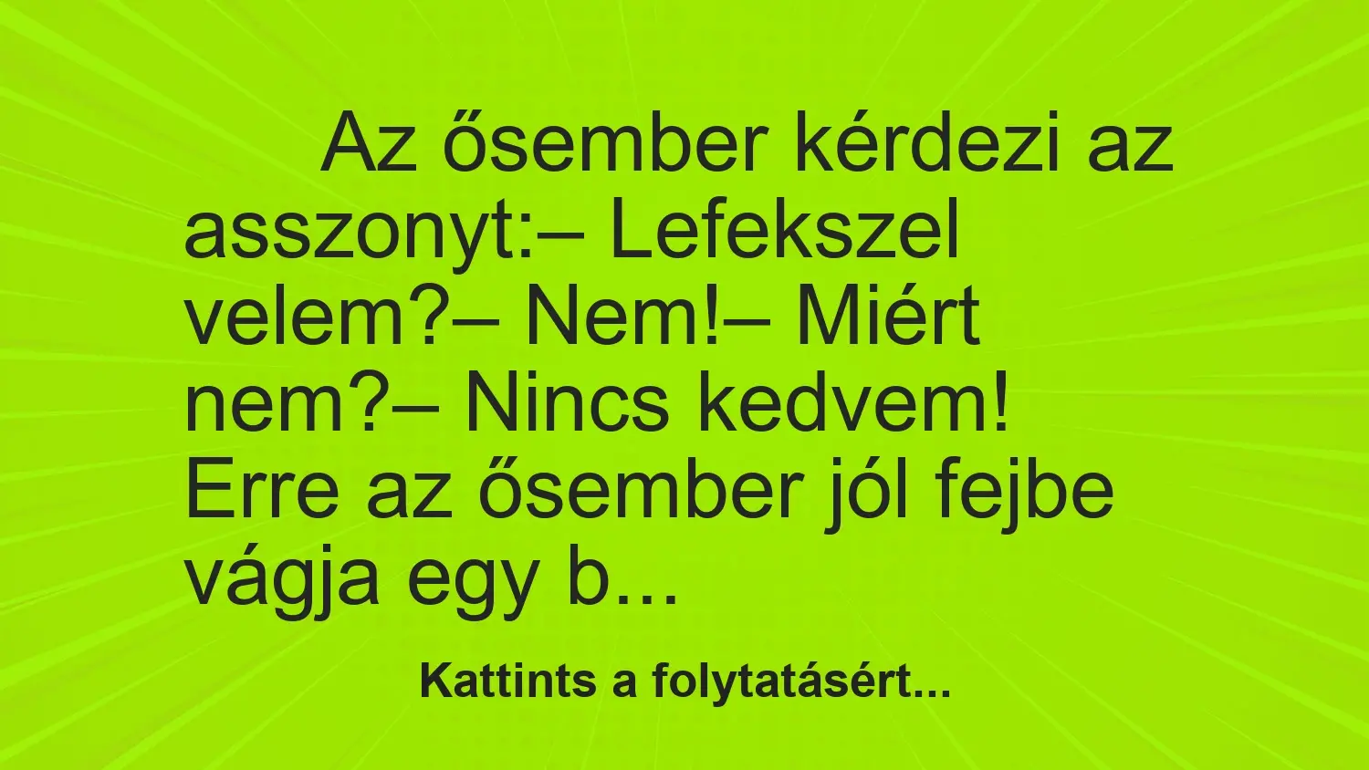 Az ősember kérdezi az asszonyt: – Lefekszel velem? – Nem! – Miért nem? – Nincs kedvem! Erre az ősember jól fejbe vágja egy bunkósbottal, majd…