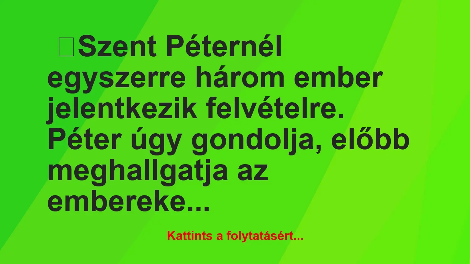 Szent Péternél egyszerre három ember jelentkezik felvételre. Péter úgy gondolja, előbb meghallgatja az embereket hogy hogyan haláloztak el. Az első elkezdi: – Megyek haza és…