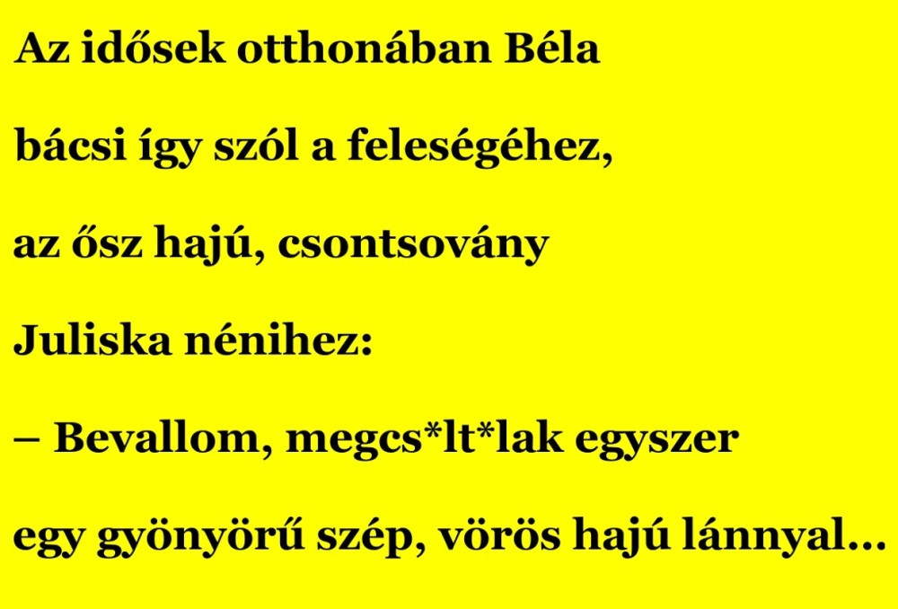 Az idősek otthonában Béla bácsi így szól a feleségéhez, az ősz hajú, csontsovány Juliska nénihez: – Bevallom, megcs*lt*lak egyszer egy gyönyörű szép, vörös hajú lánnyal,…