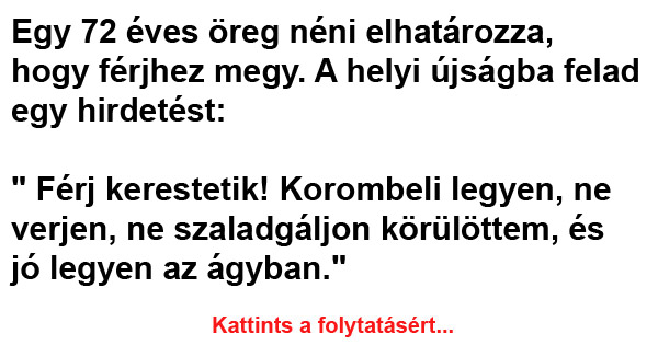 Egy 72 éves öreg néni elhatározza, hogy férjhez megy. A helyi újságba felad egy hirdetést: ” Férj kerestetik! Korombeli legyen, ne verjen, ne szaladgáljon körülöttem,…